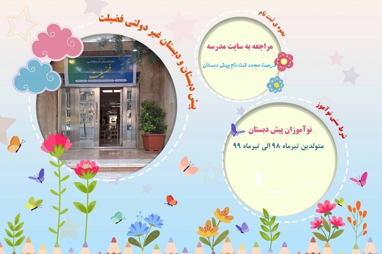 جهت ثبت نام نوآموزان پیش دبستان به بخش ثبت نام در سایت fazilat.sch.ir مراجعه نمایید.